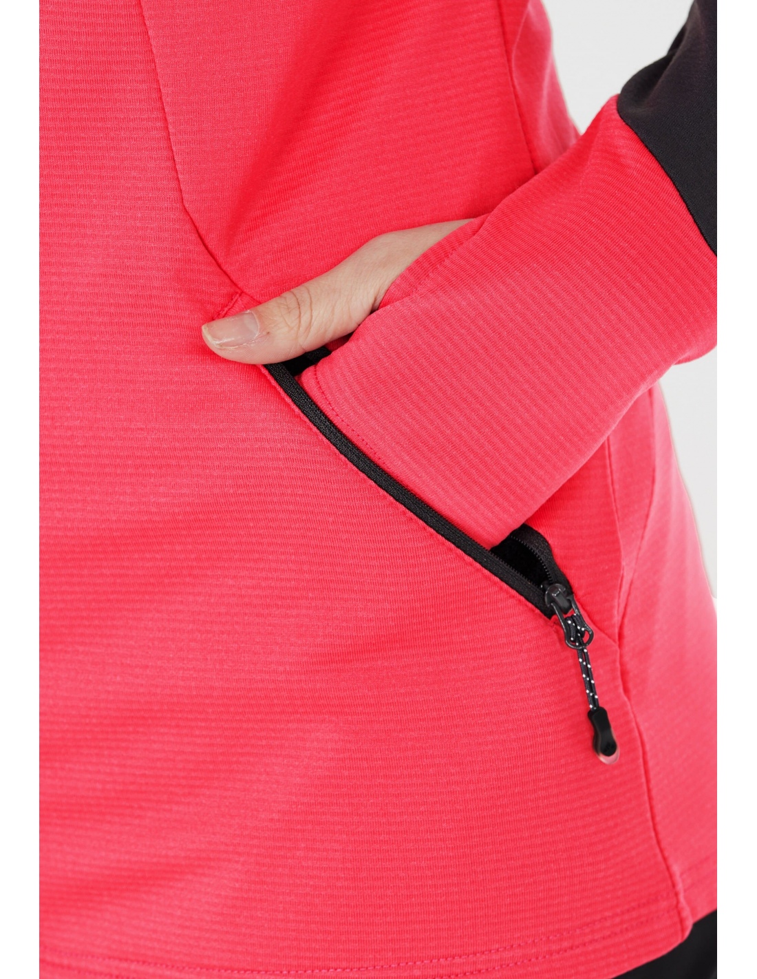 Model wyposażony jest w stójkę oraz pełny zamek błyskawiczny z osłoną podbródka, który chroni skórę przed otarciami i zwiększa komfort podczas noszenia. Dodatkową funkcjonalność zapewniają otwory na kciuki w mankietach, które pomagają utrzymać rękawy na miejscu i zwiększają komfort podczas intensywnego ruchu lub noszenia bluzy pod kurtką.