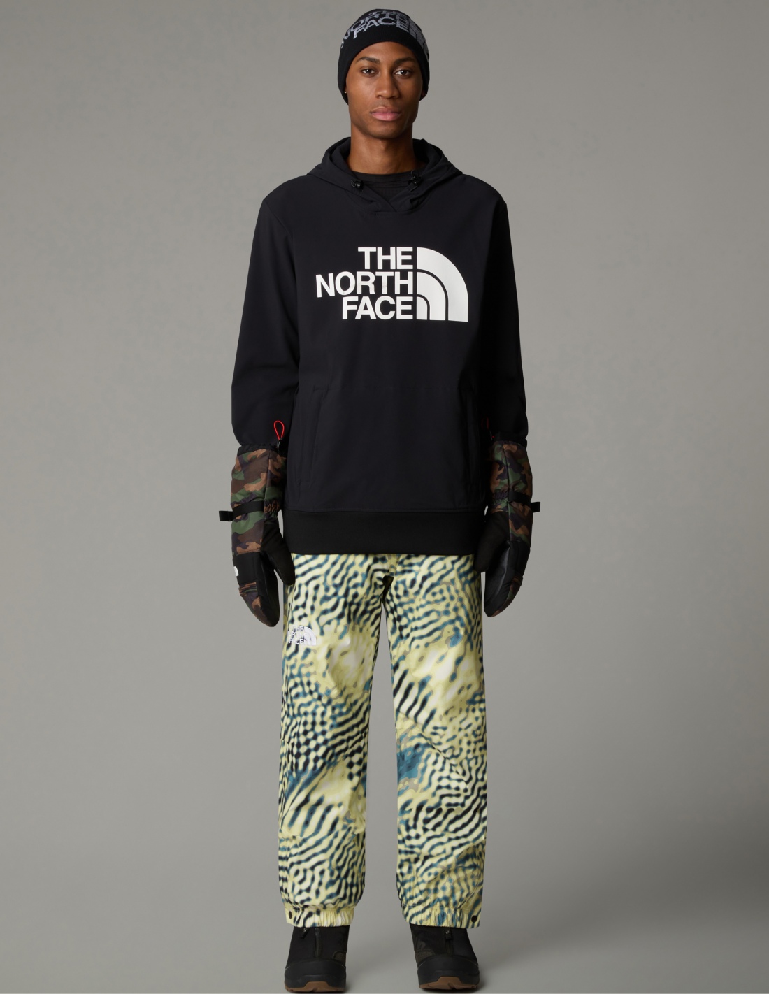 Kaptur z regulowanym sznurkiem zapewnia osłonę przed wiatrem, a kieszeń typu kangurka z zamkiem błyskawicznym pozwala bezpiecznie przechować telefon i drobiazgi. Wewnątrz znajduje się dedykowana kieszonka na urządzenia elektroniczne z przepustem na przewody. Szerokie ściągacze w mankietach i u dołu bluzy poprawiają dopasowanie, a zintegrowane otwory na kciuki zwiększają wygodę podczas jazdy na desce lub nartach. Całość dopełnia duże, charakterystyczne logo The North Face® na klatce piersiowej — symbol jakości i pewności w terenie.