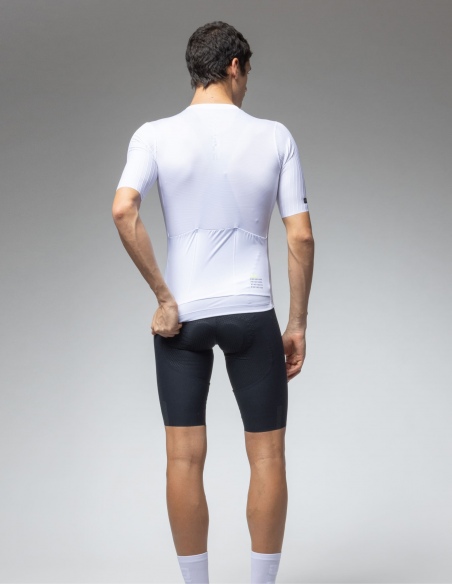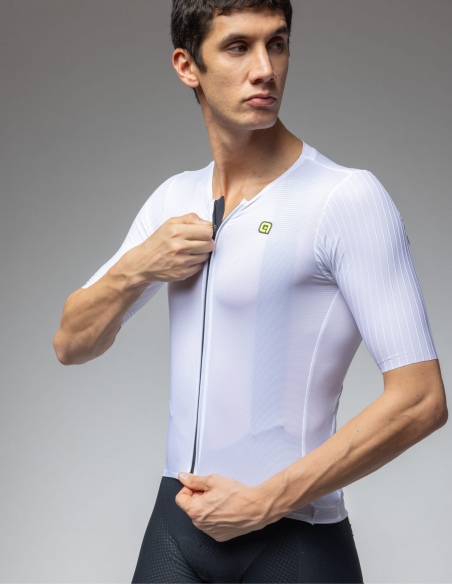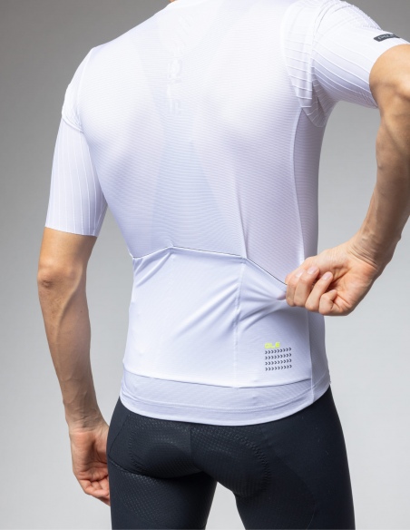 Najbardziej przełomowym elementem są rękawy wykonane z tkaniny Jet Stripes o strukturze kanałów 3D. Materiał ten, wykończony technologią Raw-cut (cięcie laserowe), minimalizuje zawirowania powietrza i zapewnia efekt "drugiej skóry". Przednie i tylne panele z materiału Light Blow gwarantują ekstremalną oddychalność, utrzymując optymalną temperaturę ciała nawet podczas najbardziej wymagających podjazdów.