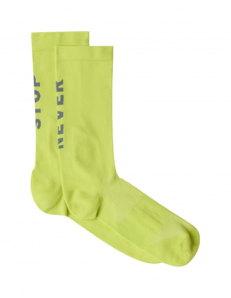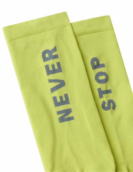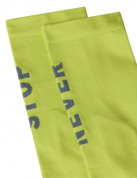 Skarpetki Never Stop o długości do połowy łydki to model, w którym każdy detal ma znaczenie dla Twojego wyniku. Zostały wykonane z wytrzymałej mieszanki poliamidu (w tym 27% z recyklingu), co gwarantuje im wysoką odporność na zużycie przy zachowaniu wyjątkowej lekkości. Kluczową innowacją jest zastosowanie kompresyjnego wzmocnienia kostek oraz wspierającego paska w dolnej części stopy, co poprawia stabilizację i zapobiega przesuwaniu się skarpety podczas dynamicznych zbiegów.