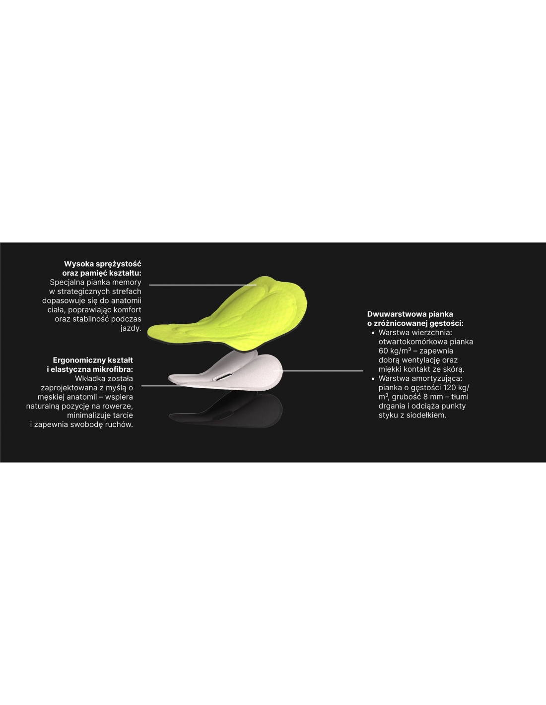 Model przeznaczony do jazdy do 8 godzin, wykonany z elastycznej mikrofibry i pianki z pamięcią kształtu. Zapewnia wysoki komfort i amortyzację dzięki dwuwarstwowej konstrukcji (120 kg/m³ + 60 kg/m³) oraz 8 mm grubości, gwarantując idealne dopasowanie i ochronę przed wstrząsami.